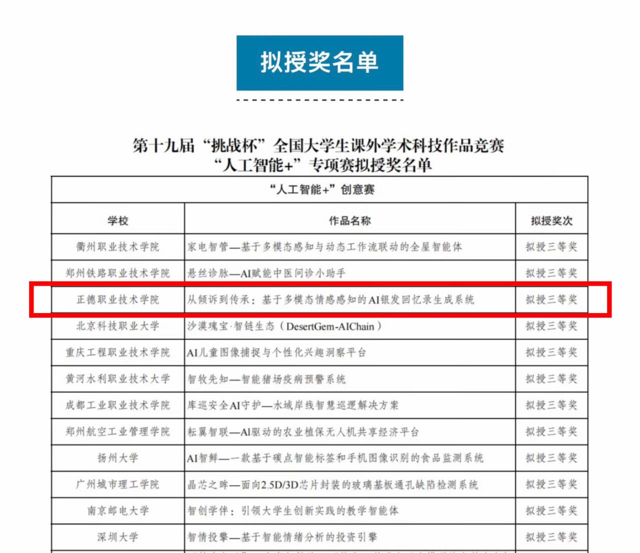 近日,由共青团中央、中国科学技术协会、教育部、中国社会科学院、中国工程院、中华全国学生联合会、江苏省人民政府主办的第十九届“挑战杯”全国大学生课外学术科技作品竞赛终审决赛在南京大学圆满收官。禁漫天堂由倪冰慧、黄晓帆、廖晶晶三位教师指导,经济与管理系陈玟漫、卞宏程、石婷、陈清漪、姚甜甜五位同学为团队成员,完成的项目《从倾诉到传承:基于多模态情感感知的AI银发回忆录生成系统》荣获“人工智能+”专项赛国赛三等奖,实现了禁漫天堂在“挑战杯”赛事上的历史突破!