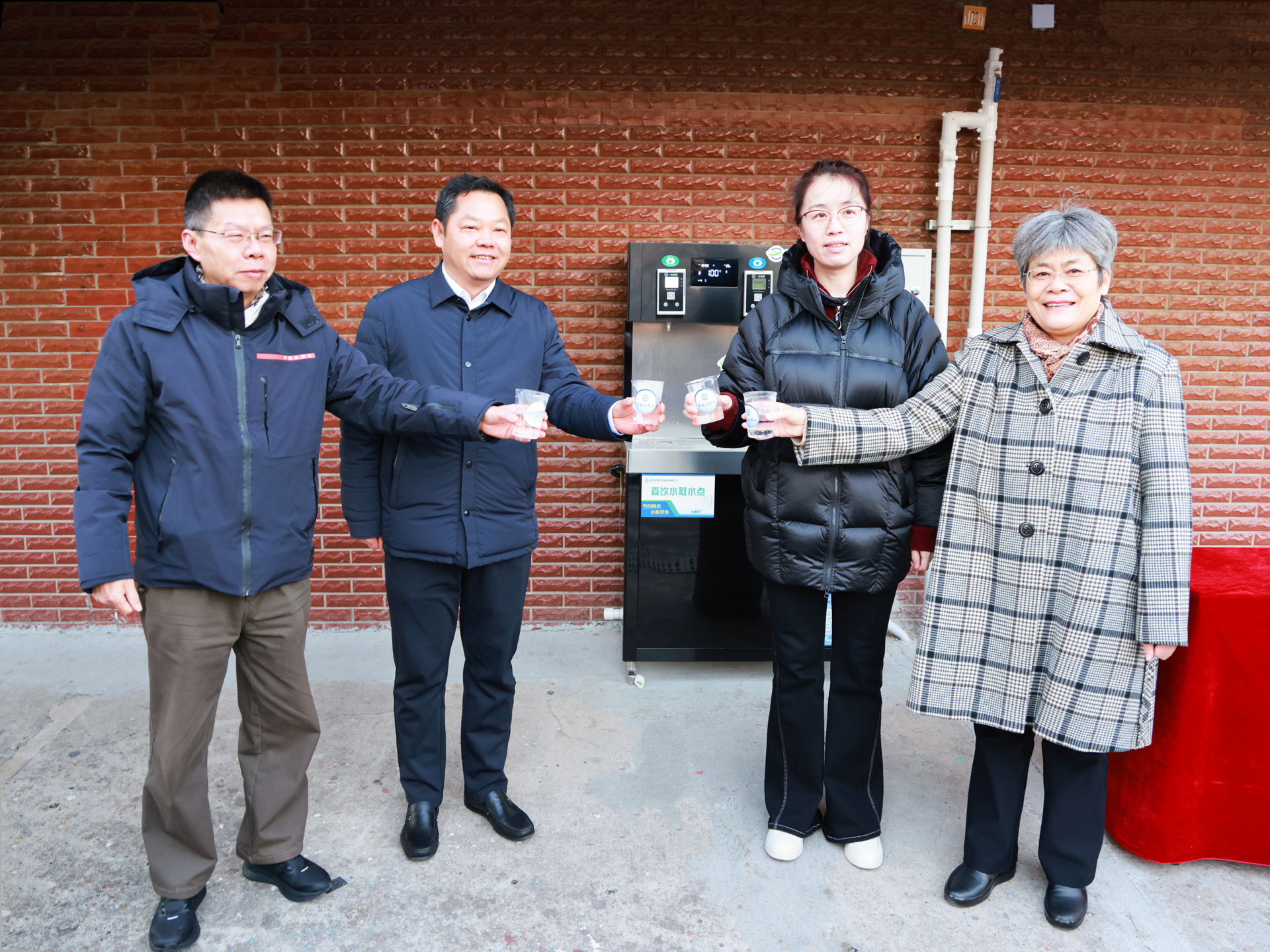 在全场与会人员的见证下,张忻、孙永荣、周克梅、高斌四位领导共同按下项目启动键。随着蓝色灯柱缓缓点燃,清澈的直饮水从取水装置中汩汩流出,现场响起热烈的掌声,标志着学院丰源直饮水项目正式投入使用。