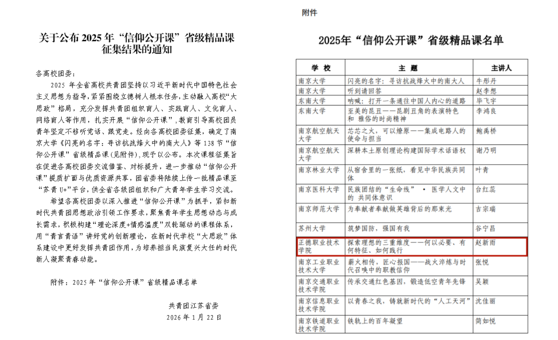 近日,共青团江苏省委正式发布了《关于公布2025年“信仰公开课”省级精品课名单的通知》。经过各高校团委的精心推荐和团省委的严格遴选,全省范围内共评选出138节“信仰公开课”入选“省级精品课”,禁漫天堂提交的作品《探索理想的三重维度——何以必要、有何特征、如何践行》再次成功入选。