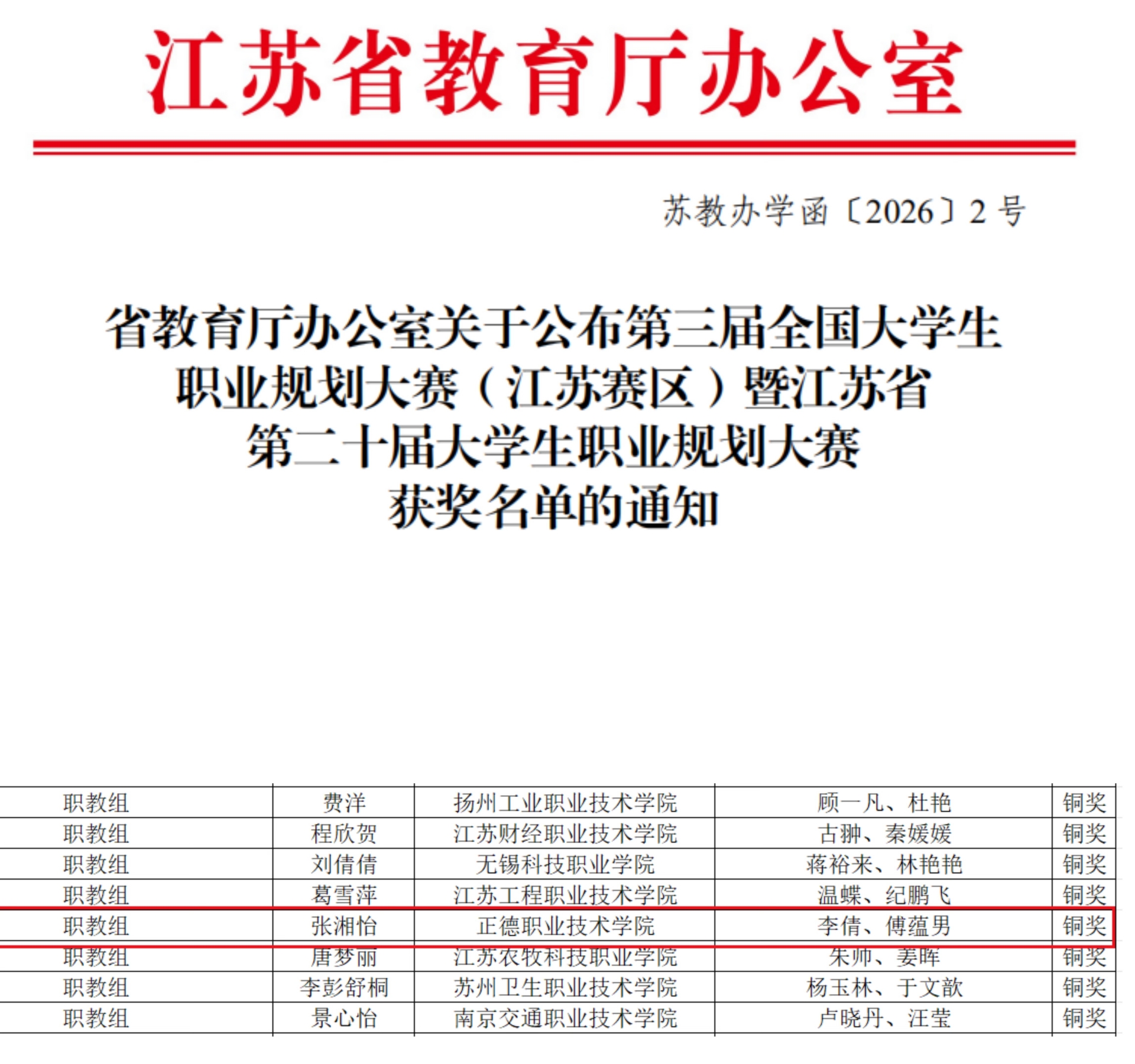 近日,第三届全国大学生职业规划大赛(江苏赛区)暨江苏省第二十届大学生职业规划大赛决赛落下帷幕。本届大赛由江苏省教育厅主办,大赛以“筑梦青春志在四方,规划启航职引未来”为主题,自2025年赛事启动以来,共吸引全省167所高校的114.8万余名学生报名参加,参赛人数首次突破百万。经过激烈角逐,职教赛道共产生金奖学生20名,银奖学生40名,铜奖学生60名。