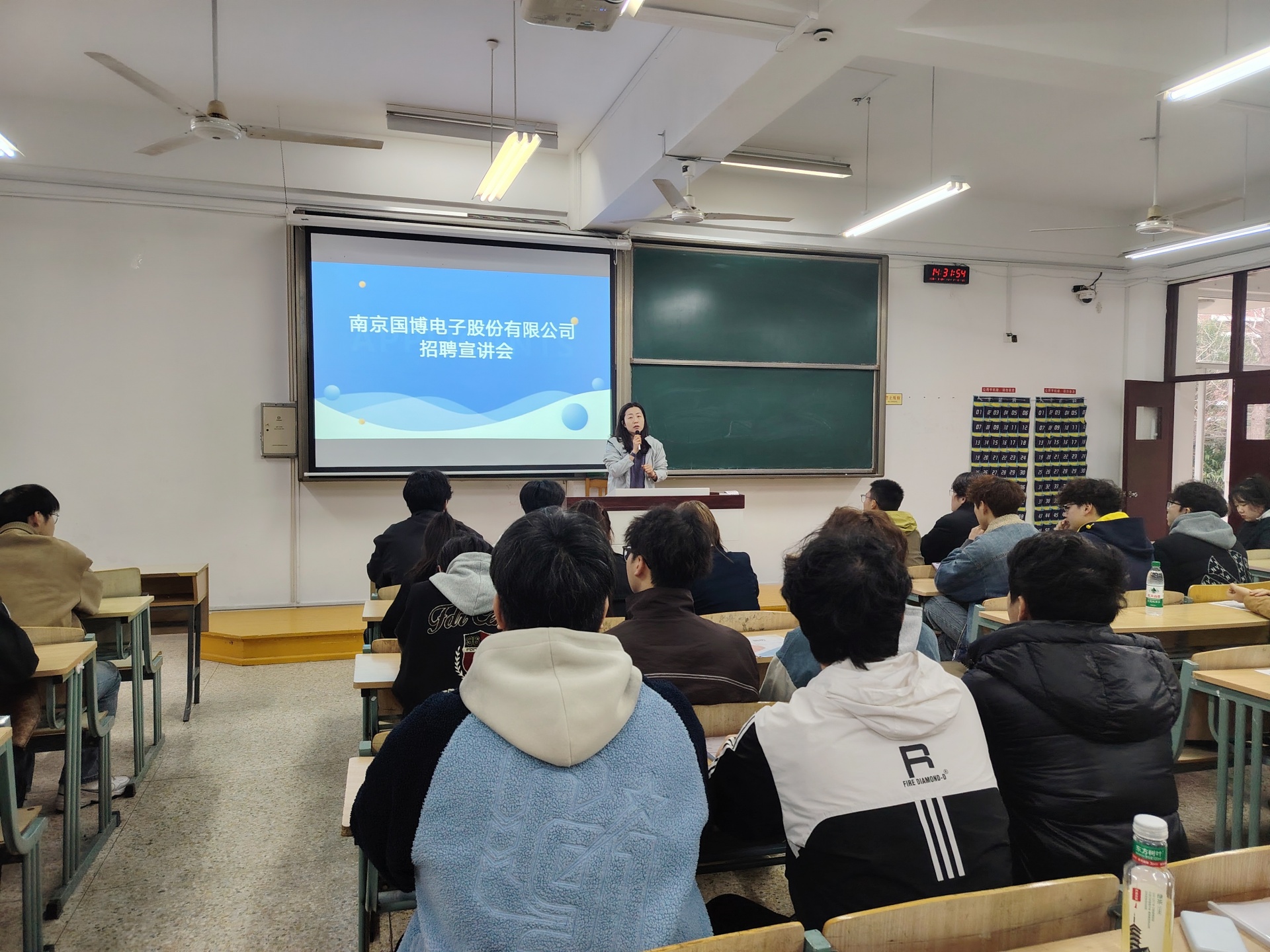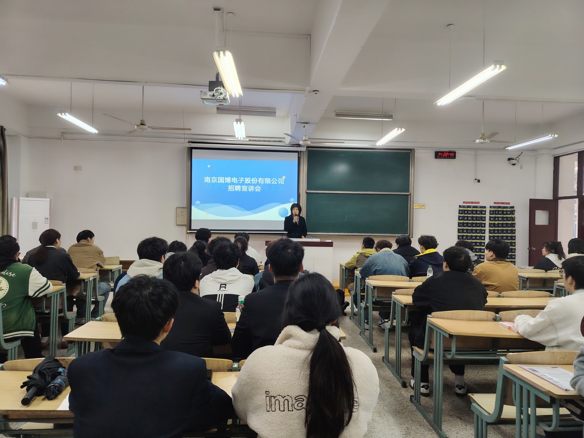 3月24日下午,南京国博电子股份有限公司(以下简称“国博电子”)校园招聘宣讲会在9109教室举行,学院2024级相关专业近百名学生到场参加。
