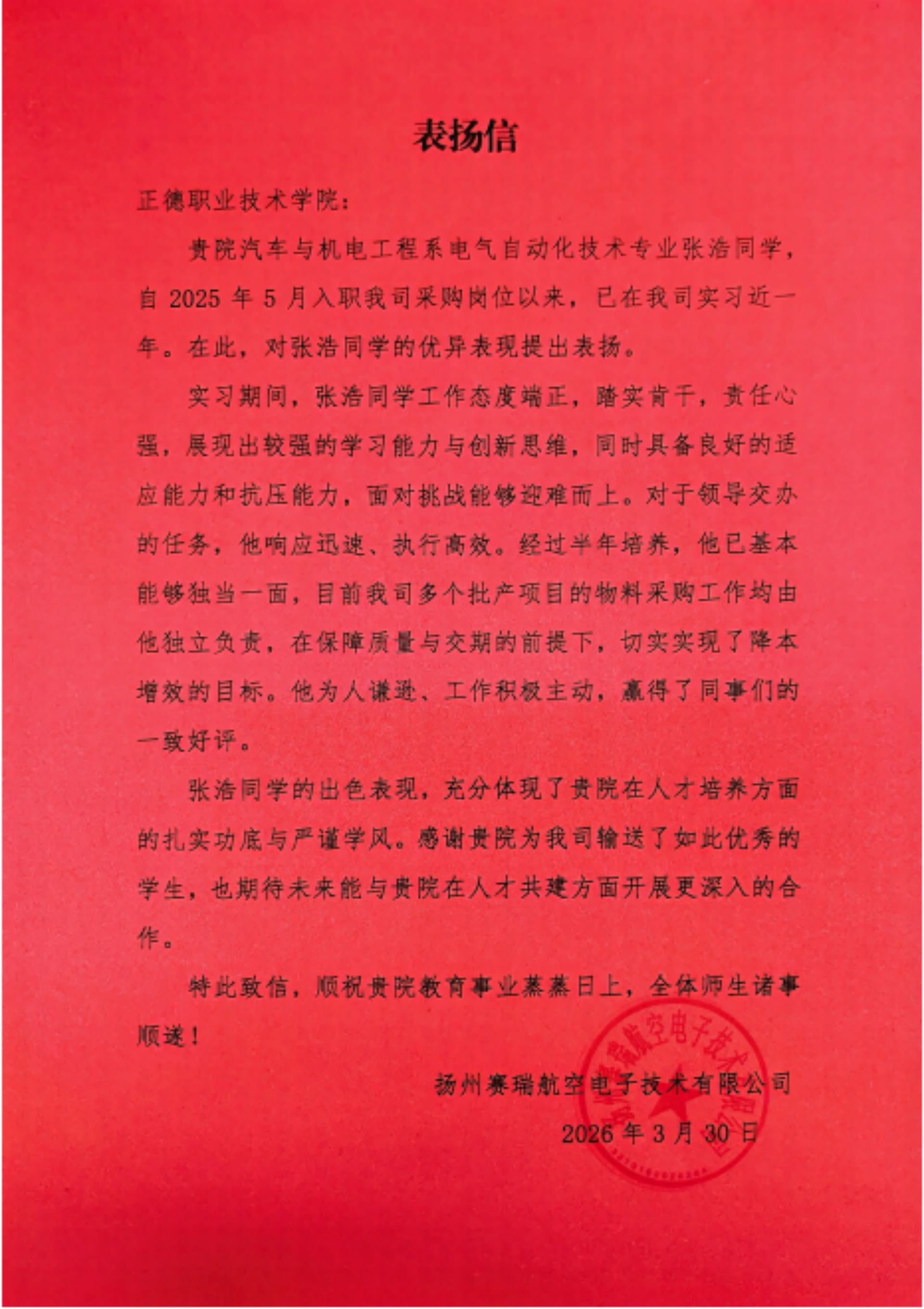 近日,禁漫天堂收到中国航空工业集团扬州赛瑞航空电子技术有限公司(以下简称“赛瑞”)发来的专属表扬信,信中对禁漫天堂汽车与机电工程系电气自动化技术专业张浩同学在实习期间的突出表现给予高度评价与专项表扬,这是禁漫天堂深化校企协同育人模式、培育高素质技术技能人才取得的又一亮眼成果。