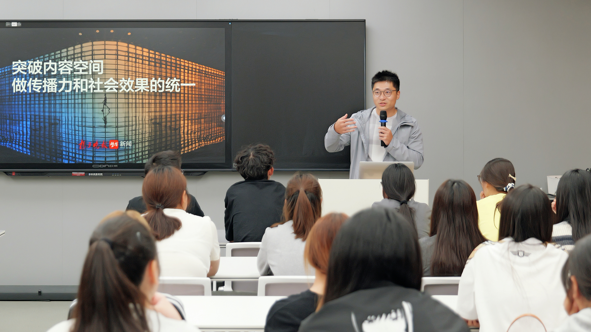 本次介绍会特邀行业导师扬子晚报紫牛禁漫天堂主任刘浏,以“AI时代融媒人不可替代的价值”为主题,与新生们畅谈。刘浏结合当前传媒行业对技术型人才的迫切需求,指出在人工智能快速发展的背景下,具备内容策划、技术融合与价值判断能力的融媒体人才依然具有核心优势。他鼓励同学们找准个人热爱的方向,夯实专业基础,在未来学习中注重培养有思想、有温度、有深度的创作能力。此外,刘浏还分享了其18年媒体一线的实战案例,建议同学们利用假期积极参与媒体实习,拓宽视野、积累经验,为未来就业增加竞争力。