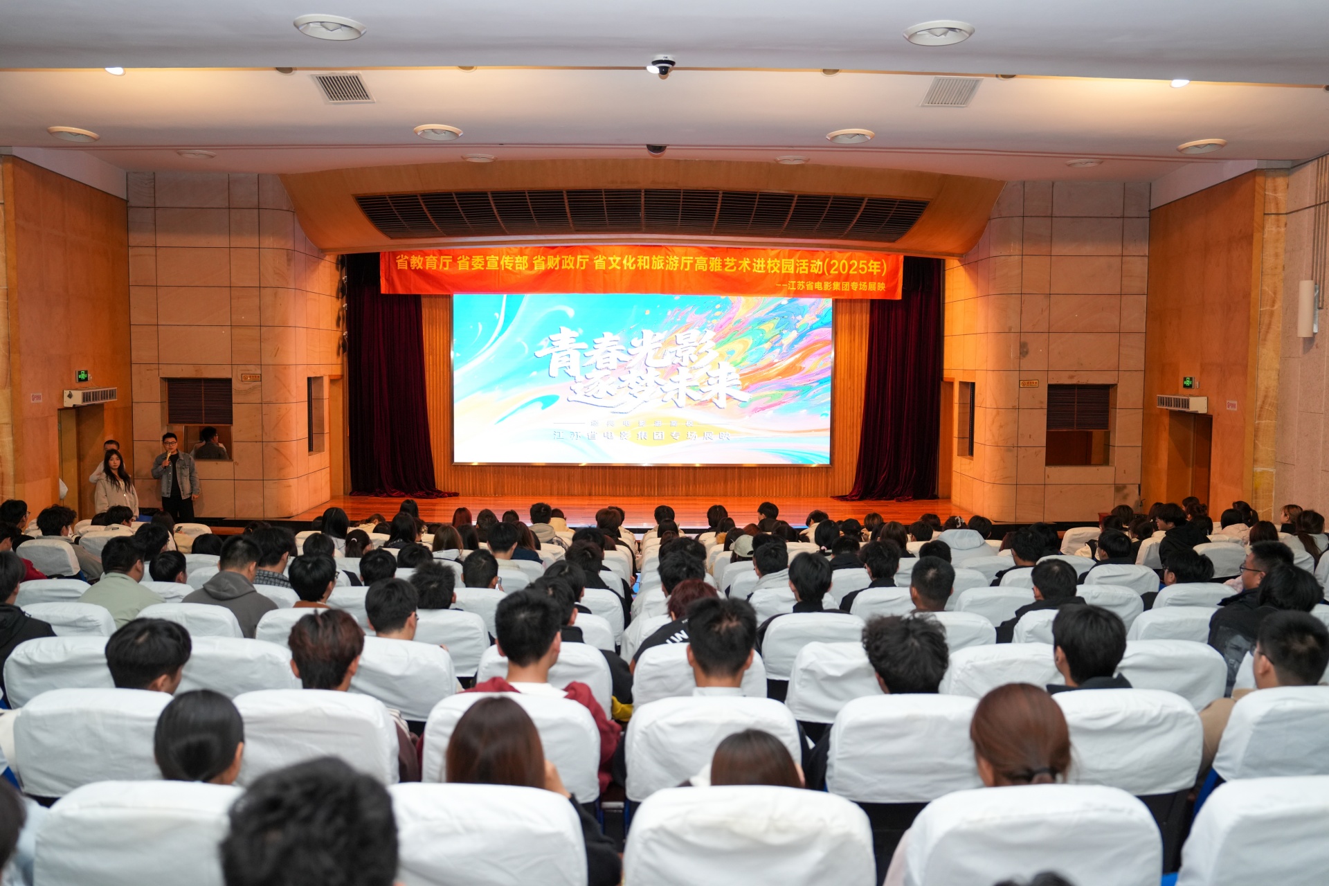 为深入推进校园文化建设,深化爱国主义教育,发挥优秀影视作品的思想引领作用,10月23日下午,禁漫天堂联合江苏省电影集团在报告厅举办“青春光影 逐梦未来”主题电影专场放映活动。本次活动精选两部兼具思想深度与艺术价值的影片《孤注一掷》《志愿军:存亡之战》,通过光影艺术为师生呈现了一场震撼心灵的精神盛宴,吸引近七百名师生到场观影,其中《志愿军:存亡之战》以其厚重的历史底蕴和强烈的情感共鸣,成为全场瞩目的焦点。