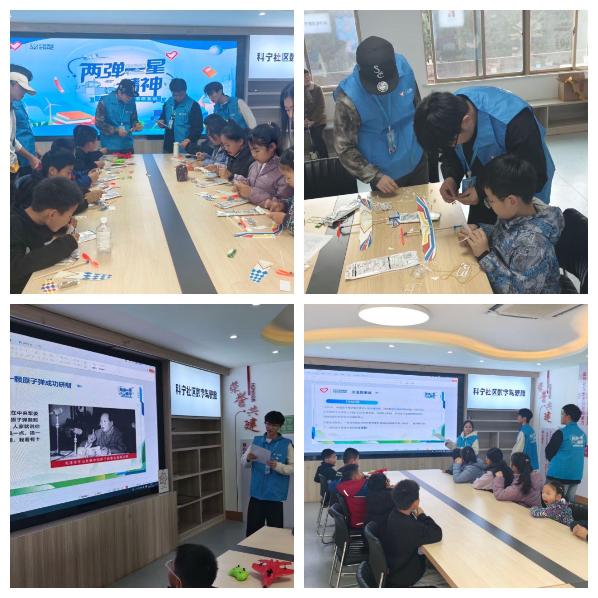 宣讲过程中,宣讲团成员聚焦于我国第一颗原子弹成功试验这一里程碑事件,阐述了其在打破核垄断、捍卫国家主权与安全方面无可替代的历史意义。活动重点讲述了杰出科学家王淦昌与郭永怀先生的生平事迹,回顾了他们毅然放弃国外优厚待遇、隐姓埋名投身国防科研事业的坚定抉择,以及他们为我国核武器事业呕心沥血、直至献出生命的崇高风范。为增强活动的趣味性和参与感,宣讲团成员还精心准备了飞机模型,现场指导小朋友们进行组装。这一互动环节不仅锻炼了孩子们的动手能力,更在他们亲身体验中深化了对航空航天知识的兴趣,拉近了与那段艰苦创业岁月的距离。