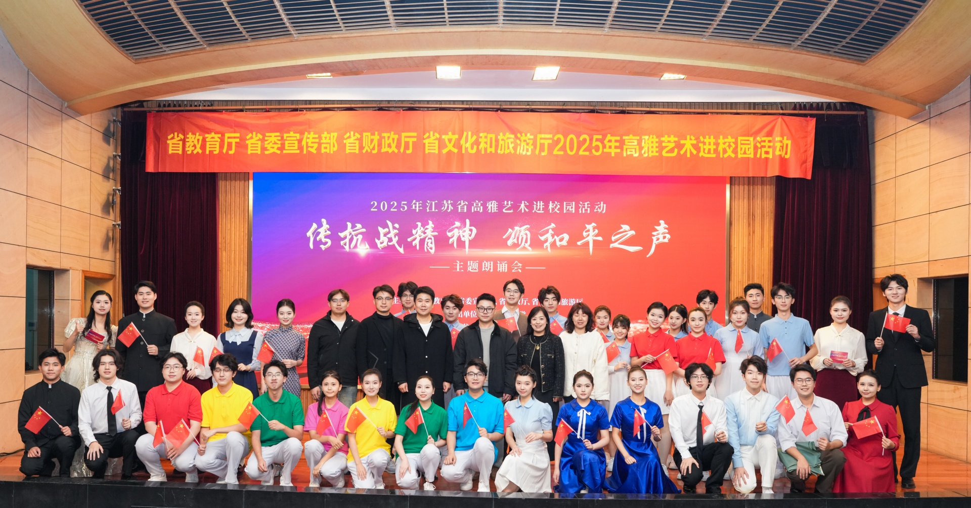 本场朗诵会围绕以爱国主义为核心的伟大民族精神,分为“追寻光,沐浴光,成为光”三大篇章。演出团队师生精选了10首不同历史时期的经典作品,以创新的美育形式构建起跨越时空的对话场域,让青年学子在艺术熏陶中深切体悟“铭记历史不是为了延续仇恨,而是为了守护和平”的深刻内涵,在赓续精神血脉中筑牢民族复兴的青春基石。