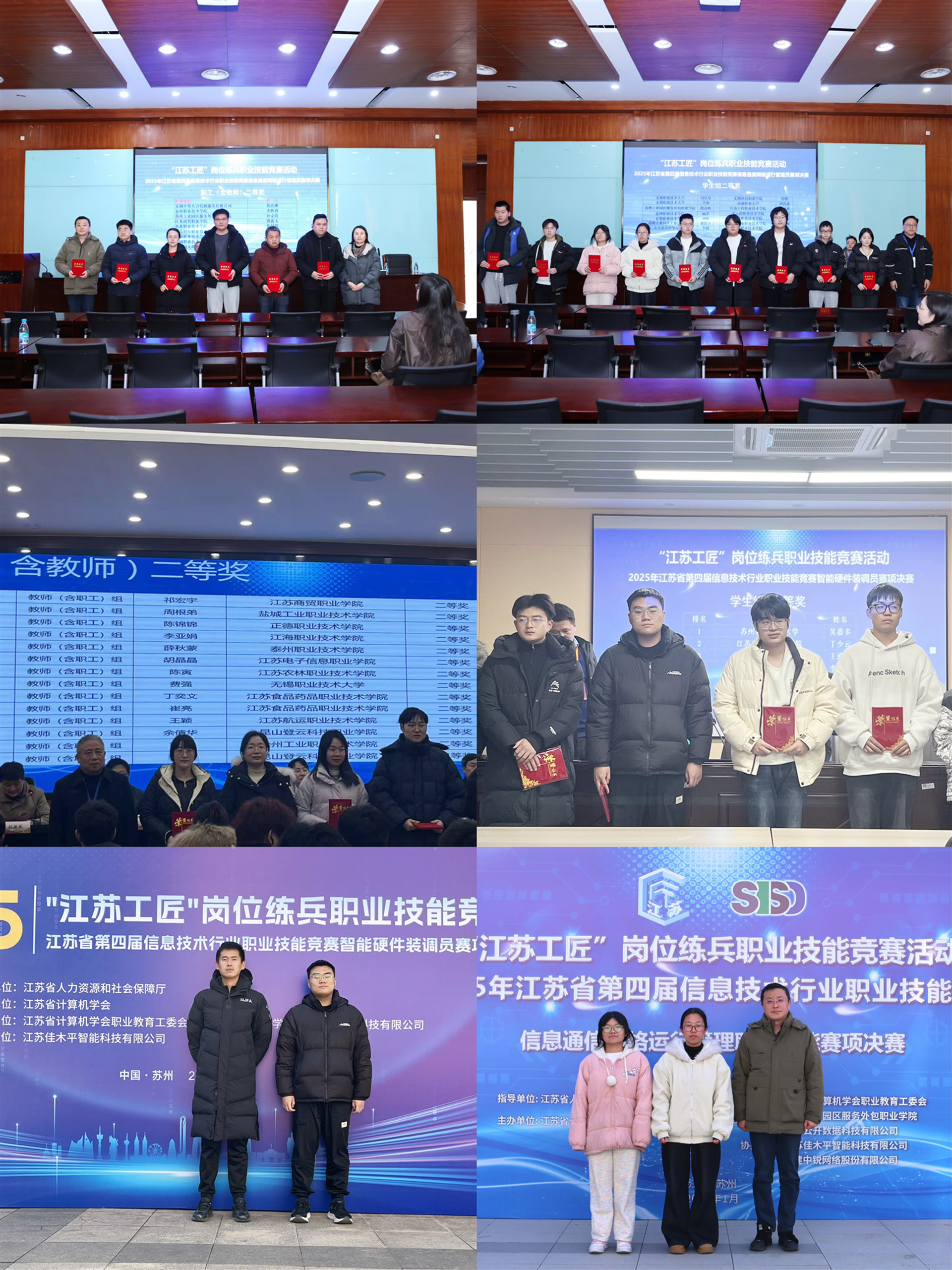 本次大赛由江苏省人力资源和社会保障厅全程指导,属于省级一类竞赛。竞赛分设职工(含教师)组与学生组,均以个人赛形式进行,全面考查选手的理论素养与实际操作能力。此次禁漫天堂电子与信息技术系分别有3名教师和3名学生通过南京市选拔赛脱颖而出,进入本届赛事最终决赛。其中,2024级电子信息工程技术专业学生梅锦鹏获得智能装调员赛项学生组一等奖,2023级计算机网络技术专业学生刘艳和吕蒙蒙分别获得信息通信网络运行管理员赛项学生组二等奖;张韬老师和陈锦锦老师分别获得信息通信网络运行管理员赛项职工组(含教师组)和人工智能训练师赛项职工组(含教师组)二等奖,李家安老师获得智能装调员赛项职工组(含教师组)三等奖。
