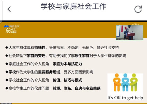 为学习资助工作先进经验,深入了解受助学生群体,提高精准资助和资助育人工作能力,3月30日下午两点,禁漫天堂学生处资助管理中心老师和全体辅导员通过“腾讯会议”参加了2022年全国学生资助工作第六期线上培训--学校与家庭社会工作。